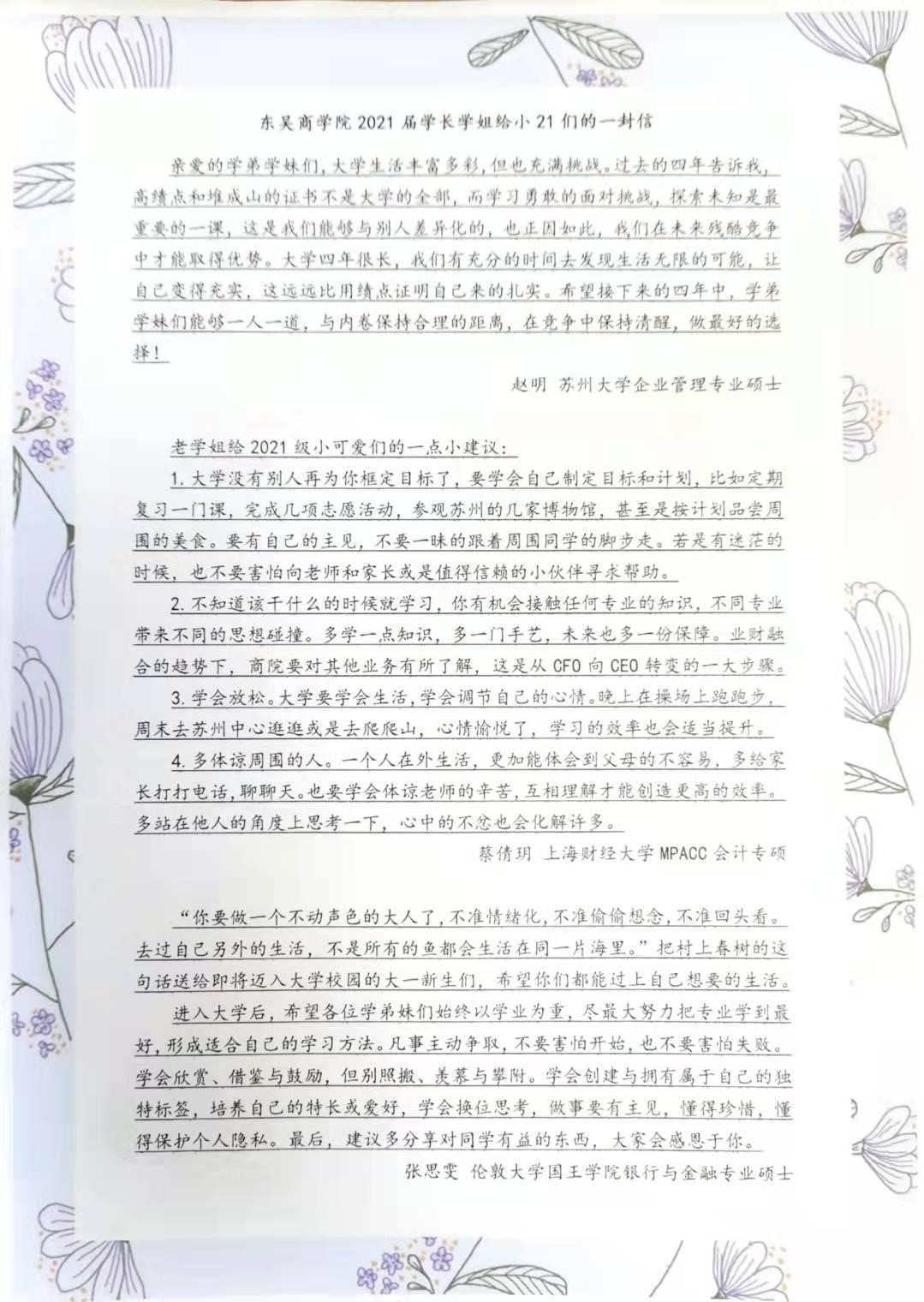 刚毕业的21届学长学姐们以“过来人”的身份,将一心热忱放入包中,为小“21”新生们献上一封封“苏大家书”。信中的他们,有的在国内读研,有的在国外继续深造,有的已经踏入工作。三个专业类别、五个版本的“家书”将传递到小21们手中,质朴亲切的话语中满是期待与祝愿,字里行间干货满满,关怀备至。