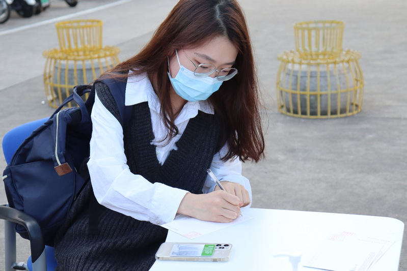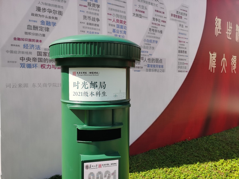 报到时,每位新生都领取到了一张盖有东吴91九色 logo并且印有苏大光景的明信片。他们在明信片上写下对未来的期许,然后将明信片投入时光邮筒。他们以这样的方式珍藏一份初心,将自己的初心寄往2025年的自己。毕业的那天,明信片会重回他们手中,在那时,回看自己四年前报到当天写下的文字,意义非凡。