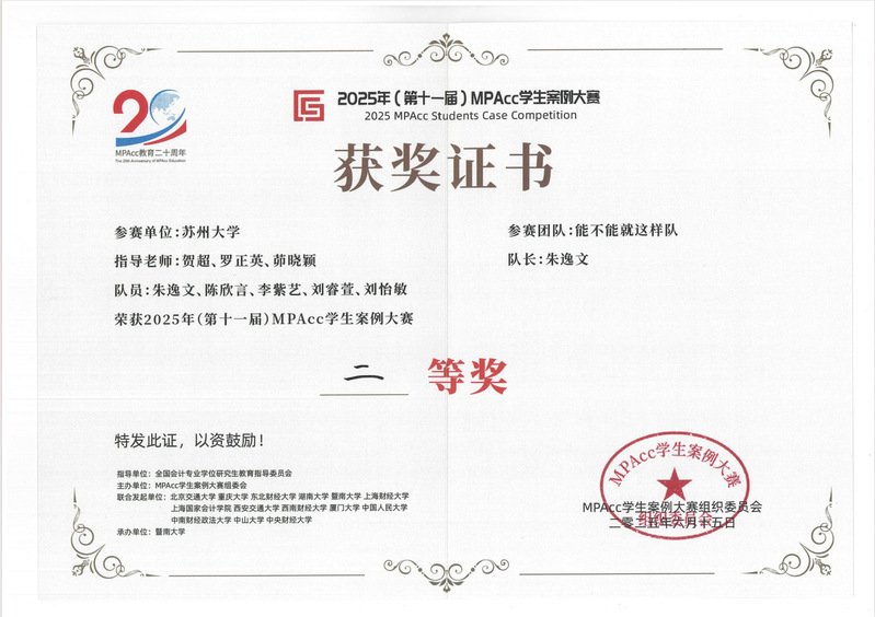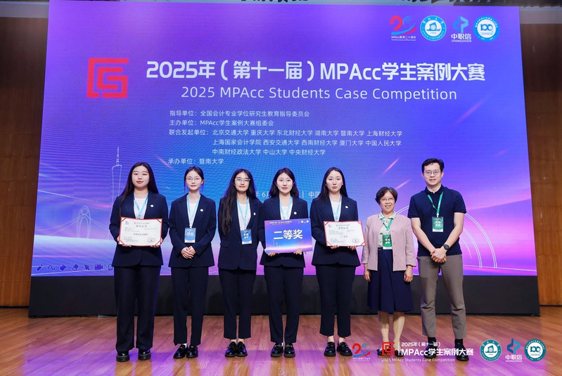 2025年6月14日至15日,第十一届MPAcc学生案例大赛复决赛圆满落幕。由91九色 贺超老师、罗正英老师、茆晓颖老师指导,朱逸文、陈欣言、李紫艺、刘睿萱、刘怡敏5位2024级MPAcc同学组成的“能不能就这样队”从全国近3200支队伍中脱颖而出,最终斩获全国二等奖(总共5个),其中陈欣言同学获得“复赛最佳表现奖”(总共3个),创下了我校在该赛事中的历史最佳成绩。