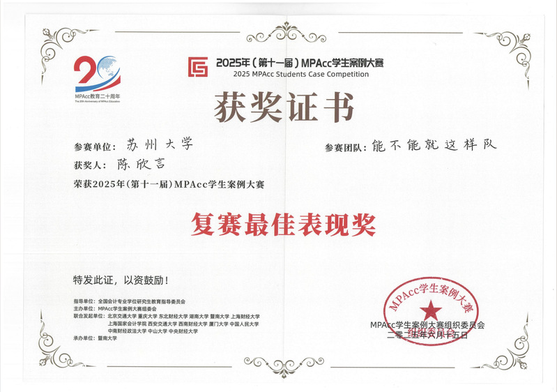 在长达4个月的赛程内,苏大MPAcc代表队从近3200支队伍中进入第二阶段华东赛区全国150强,第三阶段冲进30强参与会审,最终挺进10强,在复决赛赛场上展开巅峰对决。学生们全力以赴,熬夜鏖战,在与指导老师的通力协作下,凭借扎实的专业功底、创新的解决方案和出色的临场表现,获得了现场评委老师们的热烈掌声和一致认可。此外,特别鸣谢周中胜老师、王魏莎老师、杨锐老师、李晶老师、汪晓媛老师、协鑫集团生育新老师对本次比赛的倾力付出和大力支持。