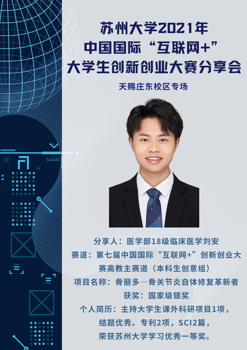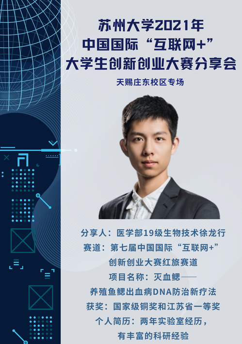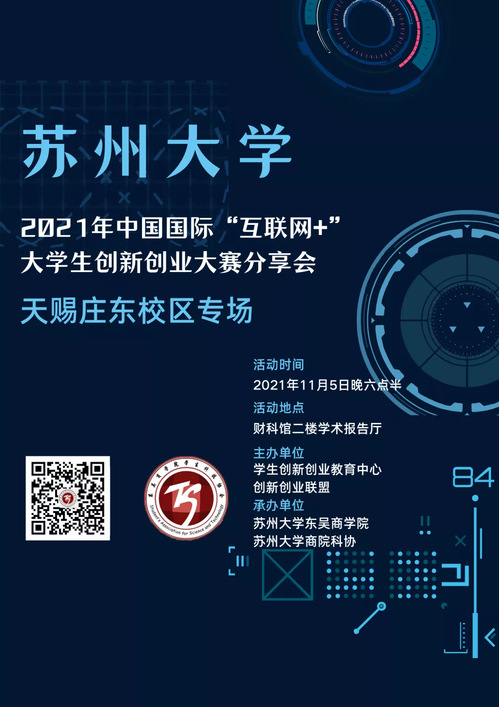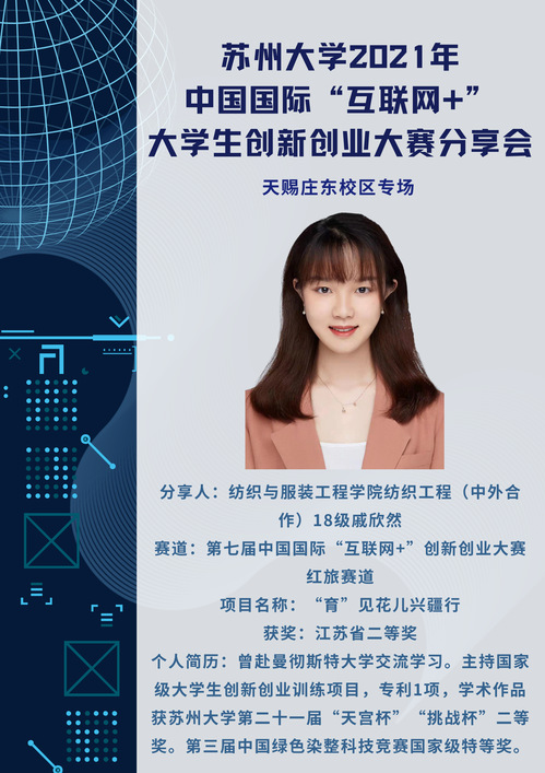 本次分享会(天赐庄东校区场)由校双创教育中心主办,东吴91九色 承办,将邀请第七届"互联网+"大赛国赛、省赛获奖项目核心成员分享参赛心得、经验和感受,涉及本科生创意组、红旅公益组、红旅创意组等组别。