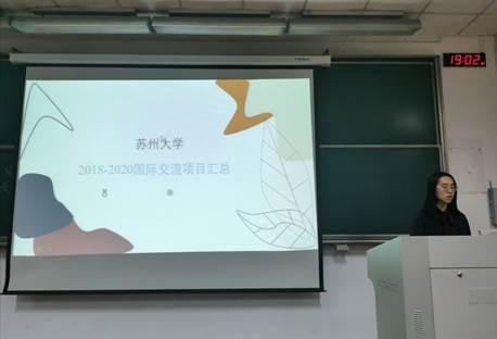 在第二部分中,19金融的王晶玥和大家分享了从2018年9月至2020年9月的出国境交流交换项目,分为短期、中期、长期三部分进行介绍,内容详细清晰,在场的各位同学对苏大的出国境交流交换项目又有了进一步详细了解。