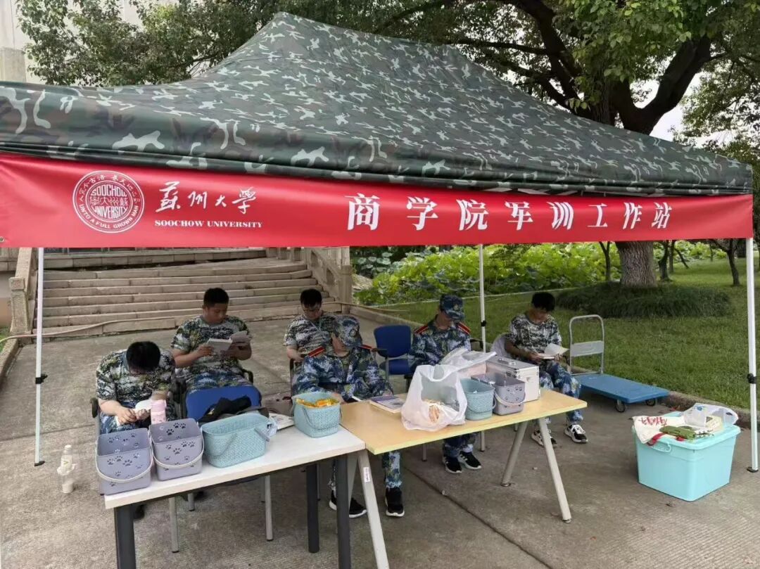 在这里,志愿者们时刻待命:整理物资、筹备补给,让训练的疲惫被贴心的服务化解。一个个收纳篮里,装着的不仅是物品,更是学院对每一位学子的关怀;他们在帐篷下的认真值守,让“商院温度”在军训场蔓延。