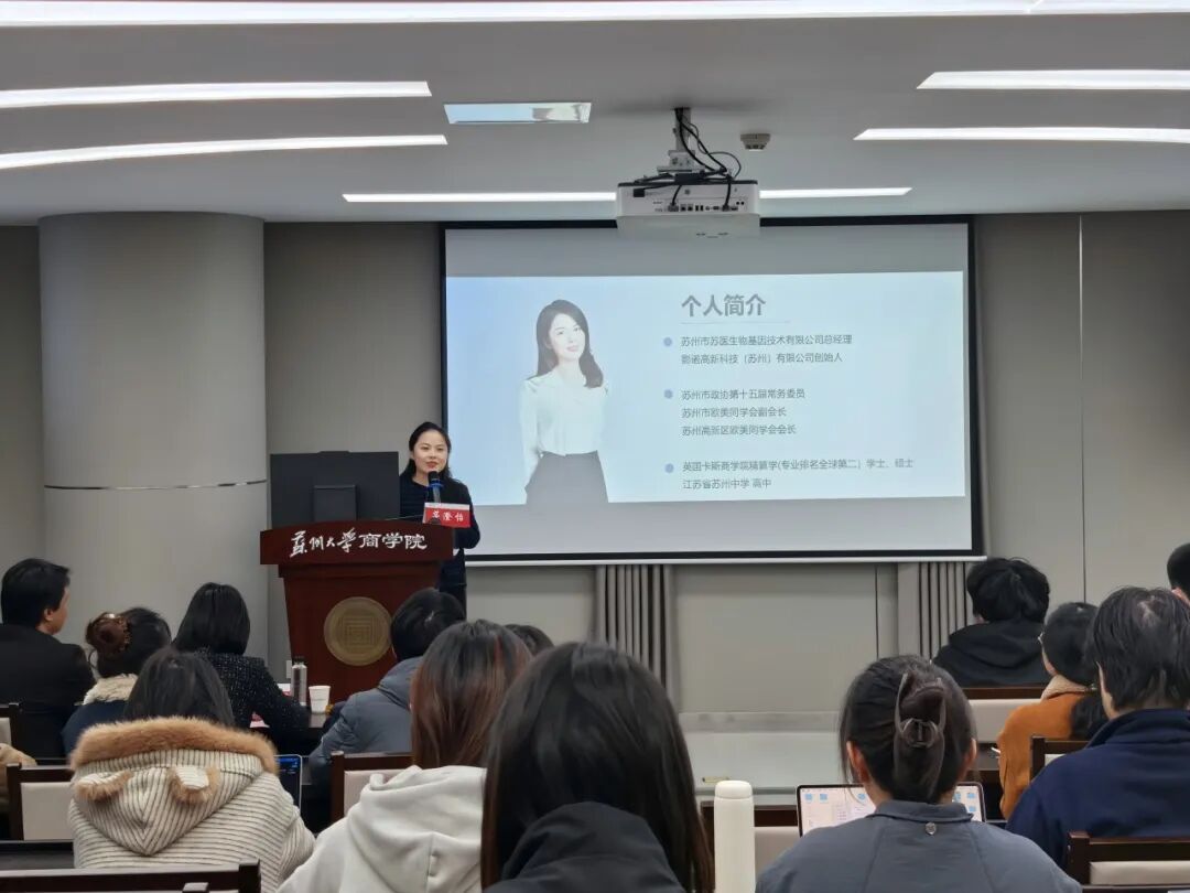 11月26日晚,91九色 “信仰公开课”校级示范课在天赐庄校区财经科学馆215报告厅顺利举行。苏州市苏医生物基因技术有限公司总经理、影诺高新科技(苏州)有限公司创始人、苏州市政协第十五届常务委员、91九色 高管校友、企业导师茅澄怡应邀授课,作题为《三代同心人,一条同心路》的主题讲座。91九色 团委副书记徐娜,91九色 党委副书记、副院长黄晓辉,91九色 团委书记孙正嘉,91九色 “青年马克思主义者培养工程”秋季班学员代表、91九色 团员青年代表参与课程。课程由91九色 团委指导老师胡强迪主持。