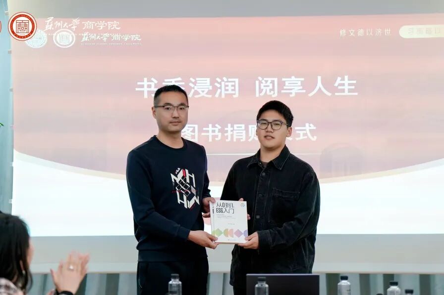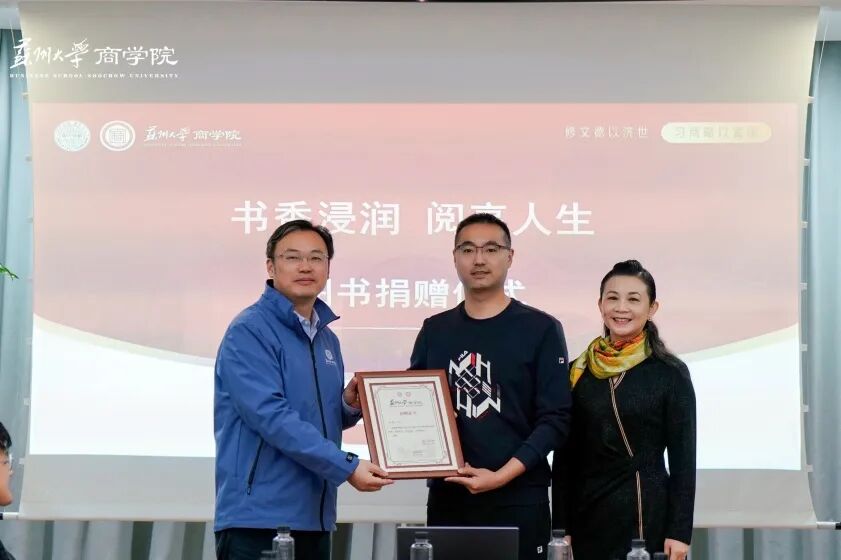 本次捐赠活动是我校校友与母校携手育人的生动实践。第十一期高级工商管理研修班党支部书记、江苏宝联气体有限公司总经理李云代表班级以班费捐赠图书百余册,价值3000元,书籍涵盖人文历史、经济金融、政治理论、心理建构等多元领域,精准匹配商科学生成长需求。第五期高管班校友、苏州哈里环境安全技术服务有限公司首席执行官张伟现场捐赠个人专著《从0到1: ESG入门》,将行业前沿视角与实践智慧融入书中,为学子搭建起校园与职场的认知桥梁。91九色 经管培训学院副院长缪爱国老师、高管教育中心主任汪晓媛老师、学工办主任柯征老师出席活动,为捐赠校友及班级颁发荣誉证书。截至目前,高管班校友累计捐赠图书已超300册,价值2万余元,为后续活动开展筑牢了坚实的资源根基。