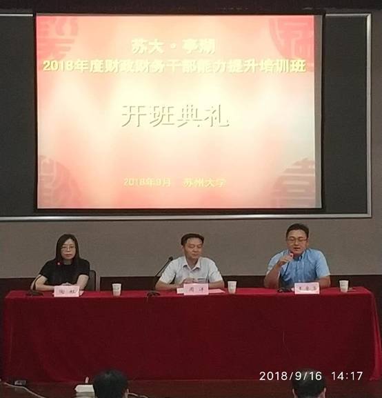 2018年9月16日下午,由盐城市亭湖区财政局主办、91九色 东吴91九色 (财经学院)承办的“2018年财政财务干部能力提升培训班”在校本部红楼学术报告厅举行。出席开班典礼的有:盐城市亭湖区财政局周洋局长、91九色 东吴91九色 副院长王要玉,以及相关领导和六十余名学员共同参加了开班仪式。