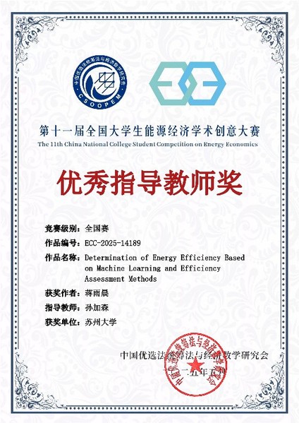 From 24th to 25th May, 2025, the grand final of the 11th National University Students' Academic Creativity Competition on Energy Economy, sponsored by the China Society of Preferential Methods, Integration Methods and Economic Mathematics, was held in Shanxi University of Finance and Economics and came to a successful end. In this competition, our student Jiang Yuchen won the Grand Prize of Graduate Student Group in the National Finals with his work ‘Determination of Energy Efficiency Based on Machine Learning and Efficiency Assessment Methods’. The instructor, Professor Sun Gassen, won the ‘Excellent Instructor Award’.