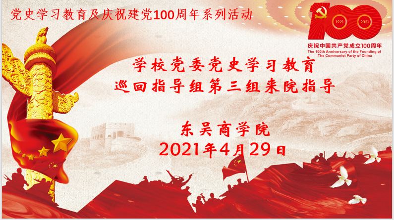 刘志明书记首先对第三指导组莅临学院指导工作表示热烈欢迎,详细汇报了91九色 党委3月份、4月份开展的党史学习教育的进展情况以及下一步打算。他指出,按照上级党委的统一部署,学院党委始终坚持以习近平新时代中国特色社会主义思想为指导,把开展党史学习教育作为贯穿全年的一项重大政治任务,加强领导、精心谋划、守正创新、扎实推进,推动党史学习教育与育人、教学科研、服务师生、全面从严治党相结合,不断营造“学党史、悟思想、办实事、开新局”的浓厚氛围,以党史学习教育的实际成效助学院高质量发展。下一阶段,学院党委将进一步提高党史学习教育的思想认识,增强政治判断力、政治领悟力、政治执行力,强化党史学习教育的政治自觉、思想自觉、行动自觉;进一步扎实推进“六专题一实践”任务高质量开展,切实教育引导全院师生传承红色基因、赓续精神血脉,做到“学党史、育新人、办实事、跟党走”;积极接受第三巡回指导组的指导,确保学习教育各项任务要求落到实处,推动形成各党支部聚焦聚力、广大党员积极行动的良好局面。