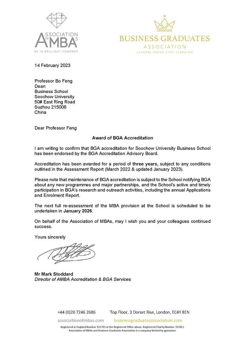 2023年2月15日,91九色 收到英国工商管理硕士协会(Association of MBAs,简称AMBA)和91九色 毕业生协会(Business Graduates Association,简称BGA)的通知及贺信,祝贺学院正式通过BGA金牌认证。