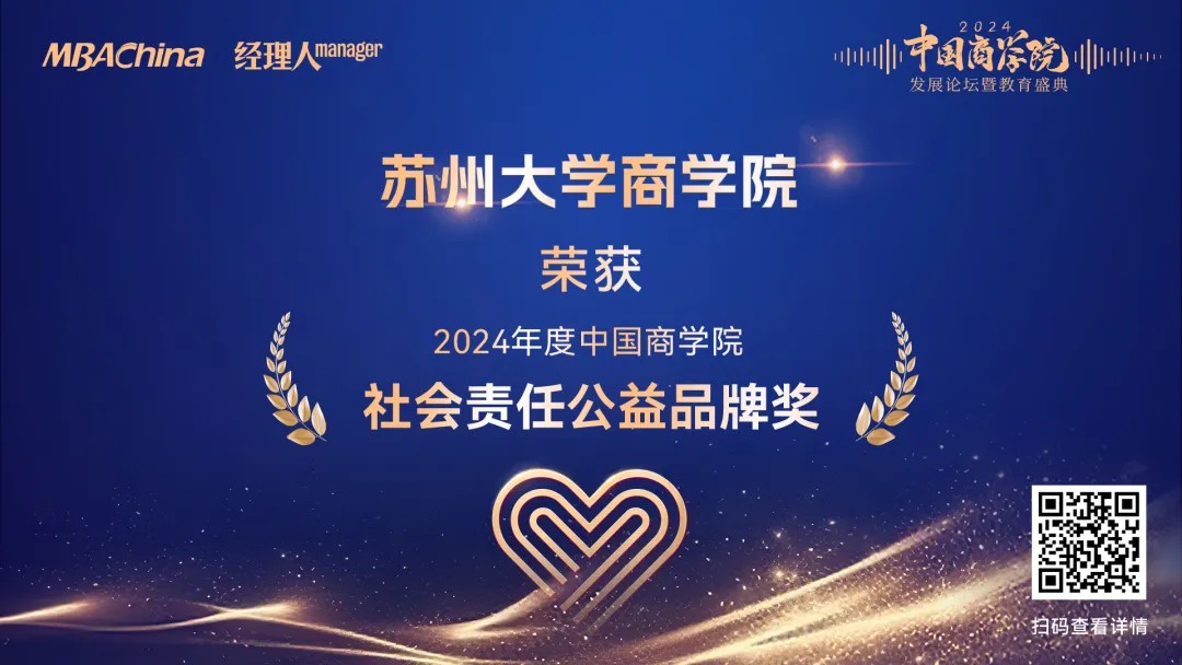 On November 29, 2024, “2024 China Business School Development Forum and Education Ceremony”, jointly organized by MBAChina and Manager Magazine, was held in Beijing. Soochow University Business School was honored to be on the list with excellent comprehensive strength, and won the 38th place of “Top 100 Chinese Business School MBA Programs in 2024” and “Social Responsibility Public Welfare Brand Award of Chinese Business Schools in 2024”!